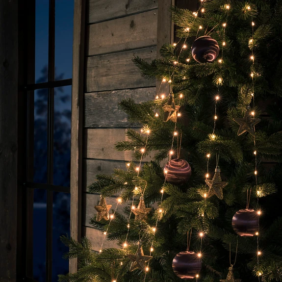 Bernsteinfarben leuchtende LED-Tropfen verteilen sich bei dem LED-Baummantel über insgesamt fünf Stränge und sorgen mit ihrem Licht für ein festliches Ambiente.
