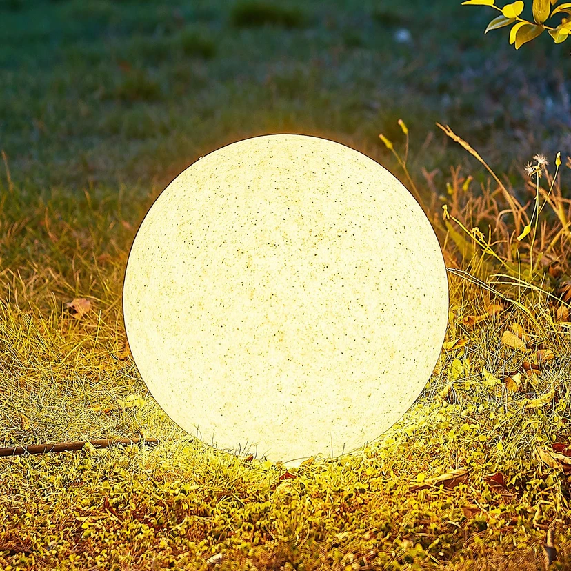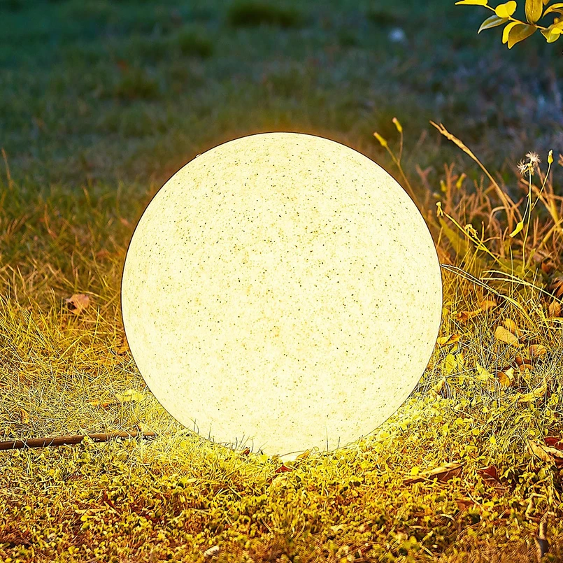 Die Verbindung mit dem Stromnetz erfolgt über ein 3 m langes Kabel mit Stecker (H05RN-F 2G1) und über beiliegende Erdspießtechnik kann man die Leuchten bei Bedarf fest im Erdreich verankern. Die strukturierte Oberfläche der robusten Kunststoffkugel überzeugt mit einer edlen Steinoptik und wirkt damit im Garten oder Vorgarten noch natürlicher.