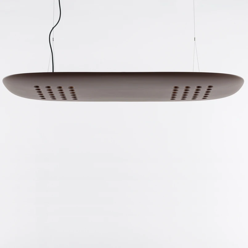 Die Pendelleuchte ALE.01 wurde vom international aktiven Design- und Architekturbüro Hassell für den italienischen Premium-Leuchtenhersteller Artemide entworfen. Im Zentrum des Konzepts steht die Nachhaltigkeit: Der flache Korpus in der Form eines abgerundeten Rechtecks ist aus einem Komposit-Material gefertigt, das sich aus den Fasern recycelter Holzabfälle und Biopolymeren oder recycelten Kunststoffen zusammensetzt. Zudem ist ALE.01 dazu ausgelegt, ganztägig das benötigte Licht zu spenden, sodass weitere Leuchten entfallen. Hierzu ist die Hängeleuchte mit zwei nach unten strahlenden und einem nach oben strahlenden LED-Modul ausgestattet, die via DALI individuell geschaltet und gedimmt werden können.