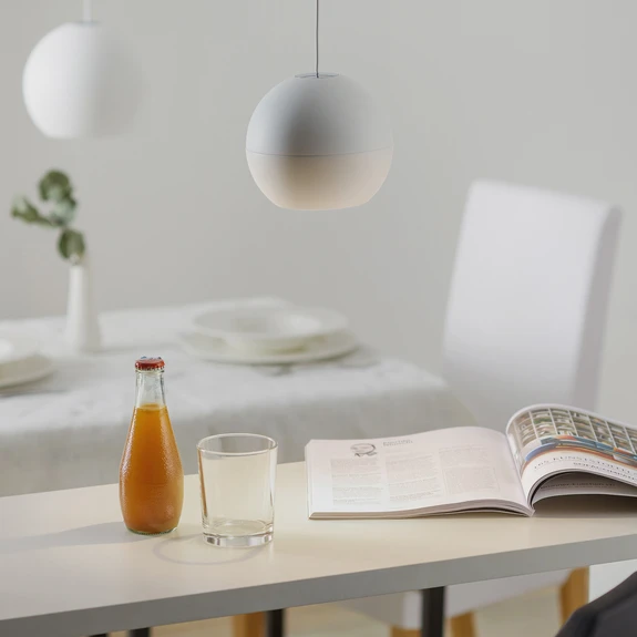 Die kugelförmige LED-Pendelleuchte Studio Line besticht mit einem minimalistischen, eleganten Aluminiumschirm. Das Licht wird von leistungsstarken und warmweiß strahlenden LEDs erzeugt, welches durch eine Silikonlinse mit einem schmalen Abstrahlwinkel direkt nach unten fällt. Bestens geeignet ist die Leuchte Studio Line daher zum Beleuchten von Tischen, Bars oder auch Empfangstresen. Ein Aufbaubaldachin ist im Lieferumfang enthalten.