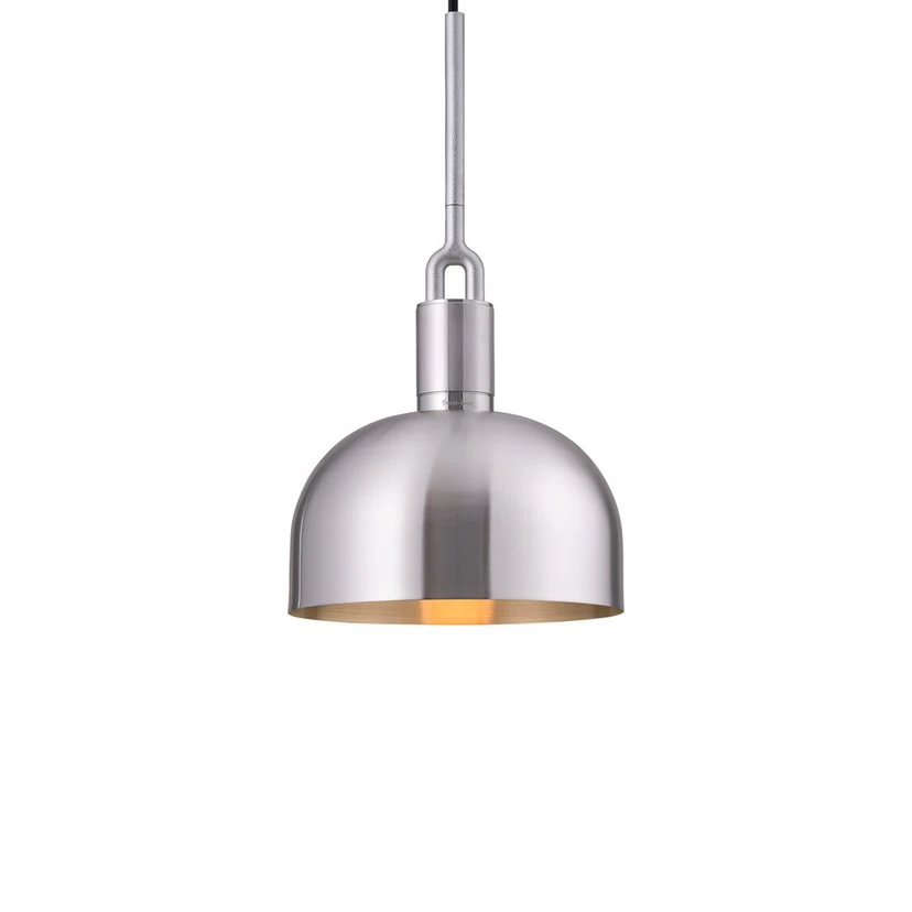 Die Pendelleuchte Forked wurde komplett aus Stahl gefertigt. Sie besteht aus einer Aufhängung, die an der außergewöhnlich gestalteten und von Hand bearbeiteten Fassung, das für den Hersteller Buster + Punch charakteristische Merkmal des Rändelmusters aufweist. Der weit nach unten geöffnete Schirm besteht ebenfalls aus Stahl. Wie alle Leuchten des Labels Buster + Punch spiegelt sich auch in dieser Hängeleuchte die Liebe des Herstellers zu hochwertigen Metallen wider. Im Schirm wurde eine E27-Fassung verbaut, ein warmweiß leuchtendes LED-Leuchtmittel ist im Lieferumfang enthalten. Mit einem für LED-Lampen geeigneten Dimmer lässt sich das Licht der Hängeleuchte Forked in seiner Helligkeit variieren. Die Lichtstrahlung erfolgt ausschließlich in einem weiten Winkel nach unten, was die Leuchte zur perfekten Tisch- oder Thekenbeleuchtung macht.