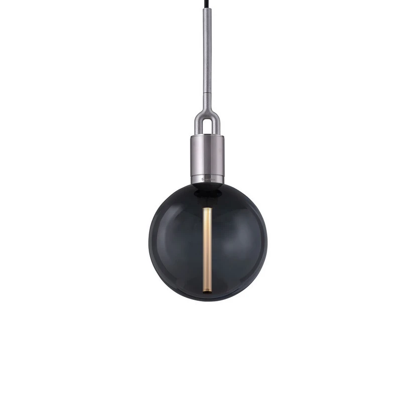 Ein Baldachin und eine Fassung aus hochwertigem, gegossenem und bearbeitetem Metall sowie ein mundgeblasener Schirm aus rauchfarbenem getöntem Glas in der Form einer Kugel - das ist die Hängeleuchte Forked des englischen Leuchtenherstellers Buster + Punch. Markenzeichen von Buster + Punch sind neben den hochwertigen Metallen, aus denen sie gefertigt werden auch die zierenden Rändelmuster im Diamantschliff, die an jeder Leuchte zu finden sind. Den Leuchtenschirm bildet eine mundgeblasene Kugel aus rauchgrau getöntem Glas. In dieser Kugel sitzt eine E27-Fassung, eine LED-Lampe mit warmweißer Lichtfarbe wird mitgeliefert. Über einen für LED-Lampen geeigneten Dimmer in der Hausinstallation kann die Helligkeit reguliert werden.