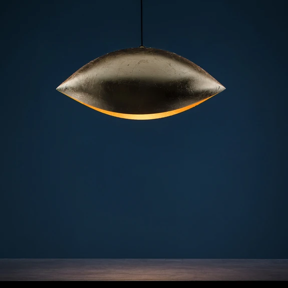 Außergewöhnlich in ihrer Form und in ihrer Lichtwirkung präsentiert sich die Hängeleuchte Malagola, eine Kreation von Enzo Catellani. Ihr Aluminiumschirm wurde in eine ovale, an den Seiten spitz zulaufende Form gebracht und komplett mit Goldfolie belegt. Durch die nach unten gerichtete Öffnung tritt ein warmes Licht aus, das eine Tischfläche oder einen Thekenbereich erhellt und den goldenen Schirm zum Strahlen bringt. Die interessante Hängeleuchte ist ein edler Lichtspender für den Esstisch in der Wohnung, stellt aber auch einen repräsentativen Lichtspender für Restaurants, Hotels und andere gewerbliche Bereiche dar.