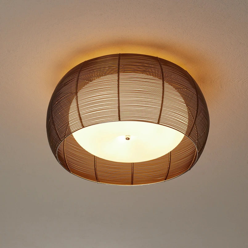 Mit in attraktiver Doppeloptik gestalteten Leuchtenschirm stellt diese Deckenleuchte eine beachtliche Erscheinung an der Zimmerdecke dar. Der äußere Schirm ist aus Metall in filigranem Strebendesign gefertigt und mit einem kleineren, satinierten Glasschirm bestückt, der nicht nur dafür sorgt, dass die beiden im Inneren sitzenden E27-Leuchtmittel kaschiert werden, sondern auch, dass eine gleichmäßige und blendfreie Beleuchtung zustande kommt. Außerdem sorgt die Satinierung des Glasschirms dafür, dass die feinen Verstrebungen des Metallschirms optimal zur Geltung kommen.