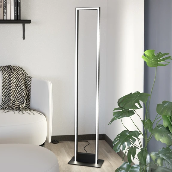 In kantigen Formen präsentiert sich die LED-Stehleuchte Savilanas-Z, eine Leuchte aus der connect.Z Reihe von Eglo. Ein Rahmen aus schwarz lackiertem Metall wurde mit zahlreichen Lichtauslässen nach vorn und hinten, an den Seiten und oben gearbeitet. Durch diese strahlt ein helles, gleichmäßiges Licht in verschiedenen Weißtönen. Ob warmweiß, universalweiß oder tageslichtweiß, die integrierten LEDs bieten das komplette Spektrum und können so entweder entspannende oder konzentrationsfördernde Beleuchtung erzeugen. Gesteuert wird das Licht über eine passende App oder einen kompatiblen Sprachassistenten. Neben dem Ändern der Lichtfarbe kann die Leuchte Rovito-Z auch gedimmt und zeitlich gesteuert werden.