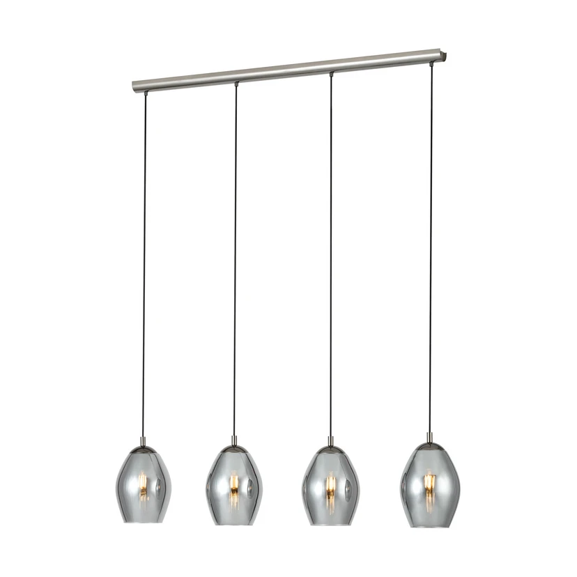 Die Hängelampe Estanys vereint modernes Design mit den hochwertigen Materialien Glas und Stahl, um eine beeindruckende Beleuchtungslösung zu bieten. Mit ihrer eleganten Farbgebung in Nickel-schwarz und Rauchgrau fügt sich die Lampe in verschiedene Einrichtungsstile ein und setzt einen schönen Akzent im Esszimmer oder Wohnzimmer.