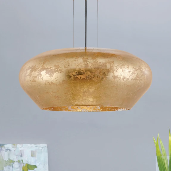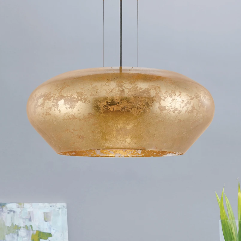 Die Hängeleuchte Priorat vereint zeitlose Eleganz und effektvolles Design. Gefertigt aus hochwertigem Glas und mit schönem goldfarbenem Finish versehen, fügt sich diese Leuchte in viele Ess- und Wohnzimmer ein und setzt dabei einen glanzvollen Akzent. Die goldfarbene Oberfläche verleiht jedem Raum eine luxuriöse Note und sorgt für eine noch wärmere Lichtabstrahlung der eingesetzten Leuchtmittel. Die Leuchte ist mit drei E27-Fassungen ausgestattet, die individuell mit den gewünschten Leuchtmitteln bestückt werden können.