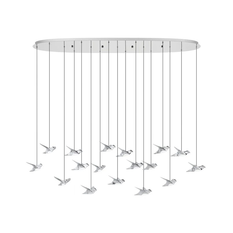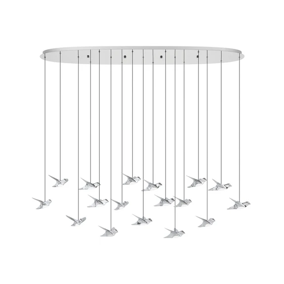 Paratebueno ist eine LED-Hängeleuchte, die Aufsehen erregt und zum Eyecatcher im Raum wird. Die Leuchte aus Stahl besteht aus einem oval geformten Baldachin, von dem 17 Vögel aus Metall abhängen, die wild umherzuflattern scheinen. Jeder dieser Vögel ist mit einem warmweißen LED-Modul hinter einer satinierten Abdeckung bestückt, so dass das Licht homogen abgestrahlt und eine weitläufige Fläche erhellt wird.