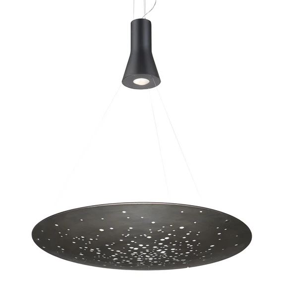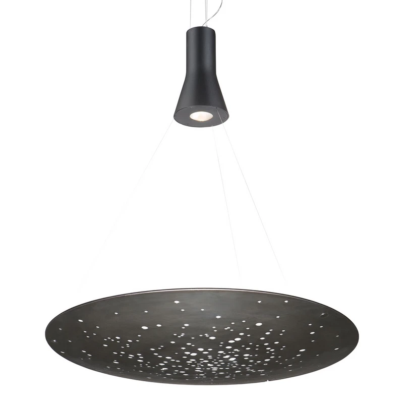 Diese Hängelampe kombiniert die bezaubernde Erscheinung der Serie Lens aus der Feder der tschechischen Designerin Lucie Koldova mit hoher Funktionalität. Ein LED-Strahler wirft das Licht auf eine mit zahlreichen unterschiedlich großen Löchern versehene, linsenförmig gebogene Metallscheibe, die ein spektakuläres Spiel von Hell und Dunkel erzeugt. Das einzigartige Finish ist das Resultat einer aufwendigen handwerklichen Bearbeitung. Hierbei wird das Material zunächst im Feuer oxidiert und anschließend gebürstet, abgeschwämmelt, poliert und geschliffen.