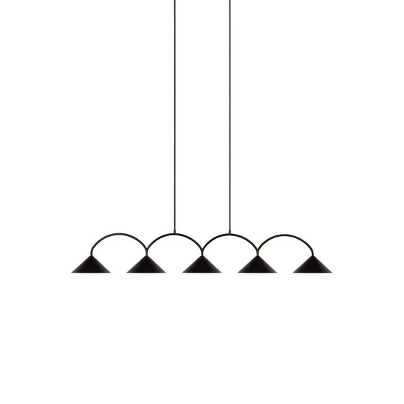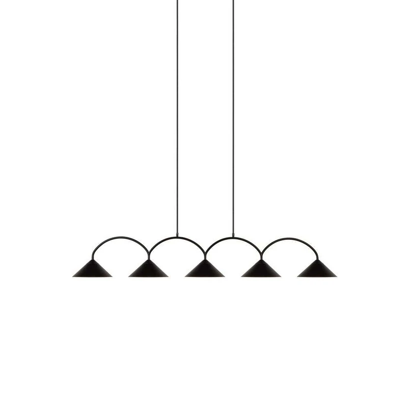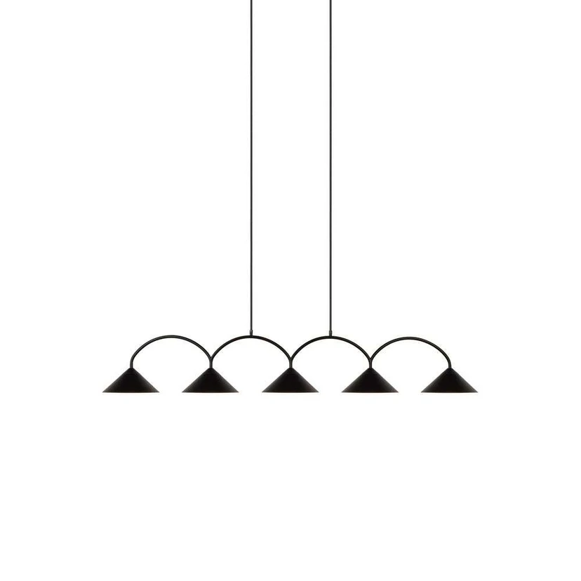 Die Curve 5 Pendelleuchte Light Black wird für ihr stilvolles, geometrisches Design und ihre breite Palette an Beleuchtungsmöglichkeiten geschätzt. Die Leuchte besteht aus mehreren Schirmen, die alle die gleiche breite, hutartige Form haben und über schöne Bögen miteinander verbunden sind, die der Leuchte ihren Namen geben. Die Lampenschirme sind in einer Reihe angeordnet und können so das Licht auf eine große Fläche verteilen, was diese besondere Curve Pendelleuchte zum idealen Beleuchtungsmodell für das Esszimmer oder die Küche macht. Hier eignet sich die Lampe perfekt über dem Esstisch, der Küchentheke, der Kücheninsel oder überall dort, wo praktische Beleuchtung benötigt wird.