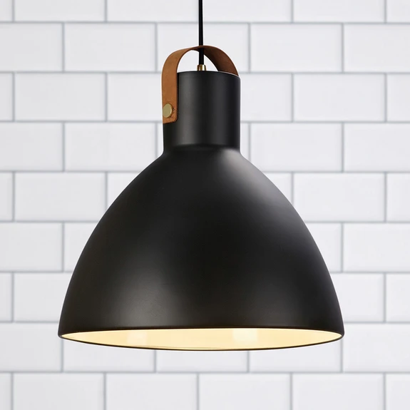Der schlichte metallische Kuppelschirm mit zylindrischem oberem Abschluss wird farblich durch das Textil-Haltekabel ergänzt. Eine Lederschlaufe auf dem Schirm sorgt für ein belebendes Element.