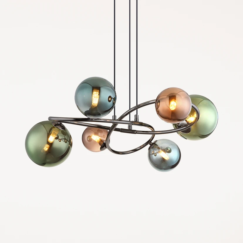 Die Hängelampe Riha vereint kunstvoll die Materialien Glas und Metall und präsentiert sich in einem beeindruckenden Farbspiel aus Bronze, Grün und Petrol. Mit ihrem großzügigen Durchmesser von 65 cm und sechs Leuchtmitteln setzt sie in jedem Wohnzimmer oder Esszimmer einen markanten Akzent. Die warmweiße Lichtfarbe sorgt dabei für eine einladende und behagliche Atmosphäre, die jeden Raum in ein stilvolles Ambiente taucht.