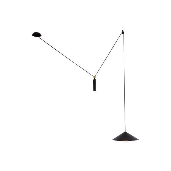 Die Hängeleuchte Alto verfügt über einen Baldachin sowie eine zusätzliche Zwischenabhängung. Zwischen diese befindet sich ein Gewicht, dass dafür sorgt, dass die Abhängung des Schirms wunschgemäß eingestellt werden kann. Alto besteht aus schwarz lackiertem Stahl und bietet Platz für ein E27-Leuchtmittel (nicht enthalten, siehe Zubehör).