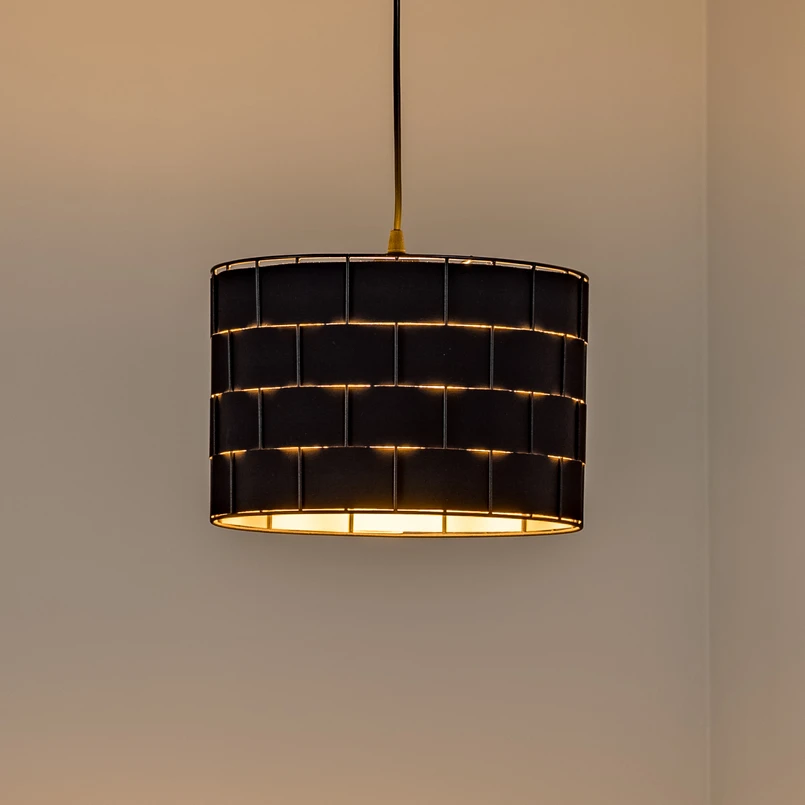 Entdecken Sie die Hängeleuchte Atlanta – ein Meisterwerk europäischer Handwerkskunst, das in jedem Wohnzimmer, Esszimmer oder Schlafzimmer eine stilvolle Atmosphäre schafft. Die schwarze Textiloberfläche und goldene Schirminnenfläche dieser Leuchte verteilt das Licht sanft und sorgt für eine angenehme Beleuchtung, die sowohl zum Entspannen als auch zur Steigerung der Produktivität beiträgt.