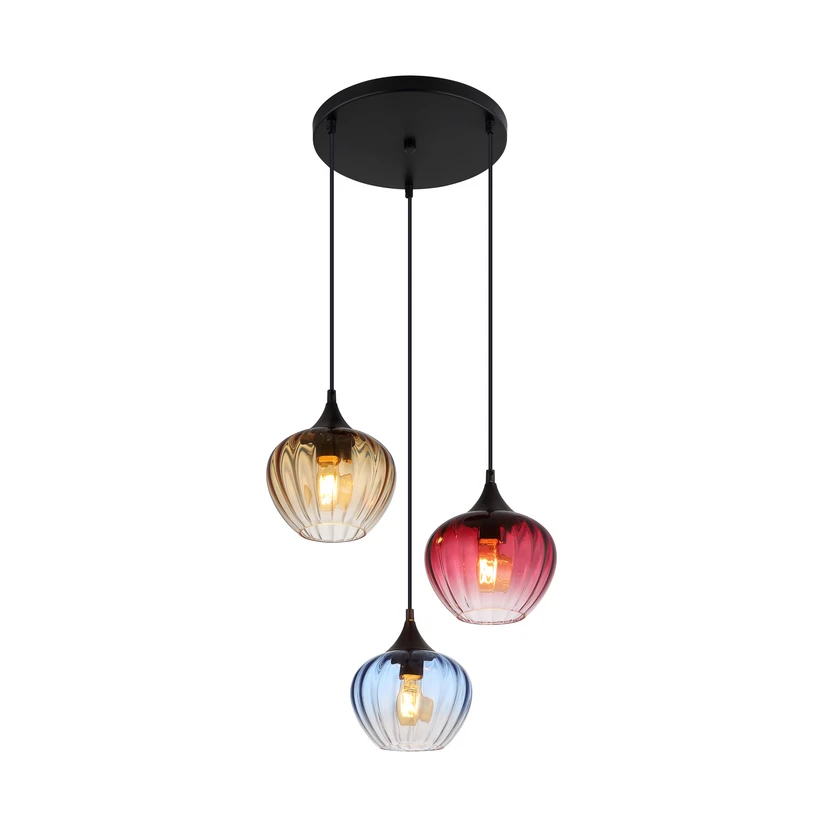 Die Hängeleuchte Sander beeindruckt durch ihr einzigartiges Design, das Glas und Metall harmonisch kombiniert. Mit einem Durchmesser von 45 cm und einer dreiflammigen Ausführung setzt sie in jedem Raum, sei es Wohnzimmer, Esszimmer oder Küche, farbenfrohe Akzente. Die Farbpalette aus Blau, Rot und Amber verleiht der Leuchte eine lebendige Ausstrahlung, die jeden Raum in ein stilvolles Ambiente taucht.