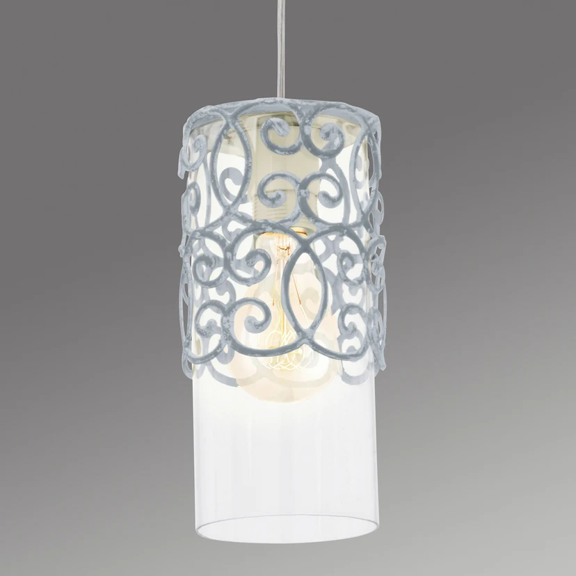Wie ein auf den Kopf gestelltes Windlicht sieht die schöne Hängeleuchte Vintage aus: Das Stahlgestell in Grau-Blau gefällt mit einem nostalgischen Muster, das klare Leuchtenglas sorgt für ungehinderte Lichtabstrahlung nach allen Seiten und für eine ansprechende Allgemeinbeleuchtung.