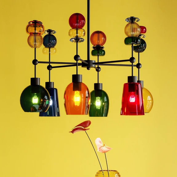 Die Hängelampe Mazzo Sei ist mit einer schwarzen Stahlstruktur ausgestattet, welche sich aus einem runden Baldachin, einer vertikalen Stababhängung und sechs horizontal nach außen strebenden Armen zusammensetzt. Letztere halten je eine nach unten gerichtete Lampenfassung. Zentrales Gestaltungsmerkmal sind die Lampenschirme sowie weiteren Elemente aus Glas in zahlreichen variierenden Formgebungen und Farbtönen. Hierdurch erhält die Hängeleuchte Mazzo Sei einen kreativen, lebendigen und farbenfrohen Charakter.