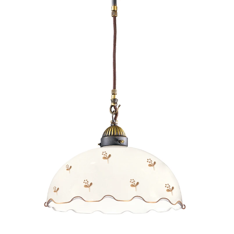 Die Hängelampe Nonna vereint zeitlose Eleganz mit rustikalem Charme. Gefertigt aus hochwertigem Glas und Messing, beeindruckt sie durch kunstvolle Details wie den gewellten Rand und die zarte Blumenverzierung, die von Hand auf das Glas aufgebracht wurde. Nonna verbreitet in jedem Raum eine warme und einladende Atmosphäre. Perfekt für Wohn- und Essbereiche sowie Flure, fügt sich die Lampe harmonisch in ein klassisches oder ländliches Ambiente ein.