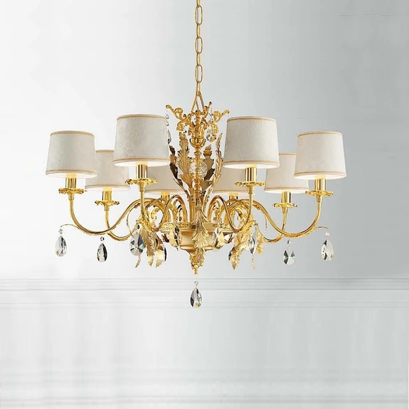 Es ist der Prunk vergangener Zeiten, der diesen stilvollen Kronleuchter schmückt. Aufwändige Verzierungen und elegant geschwungene Formen fügen sich zu einem überaus stilvollen Gesamtbild zusammen, das auch heutzutage allerlei Räumlichkeiten ziert. Der Blick richtet sich zunächst auf das pompöse Gestell mit seinen sanft gebogenen Armen, das wirkt, als wäre es von zarten Federn umgeben und so den klassisch-antiken Eindruck unterstreicht. Weiße Lampenschirme aus edlem Damast mit goldfarbener Borte sorgen dabei für angenehmes, wohnliches Licht in der Umgebung während die Asfour-Kristalle ansprechende Akzente setzen.