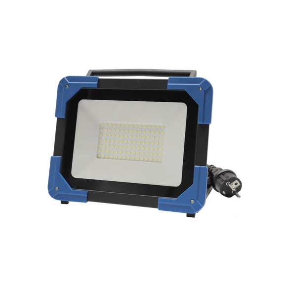 Aus schwarzem Aluminiumdruckguss mit blauen Schutzkanten besteht der LED-Baustrahler Ledar, der mit einem fahrbaren Kunststoffständer ausgestattet ist. Er lässt sich am wassergeschützten Ein-/Aus-Schalter bedienen und ist mit einer 1,5 m langen Zuleitung mit Stecker ausgestattet.