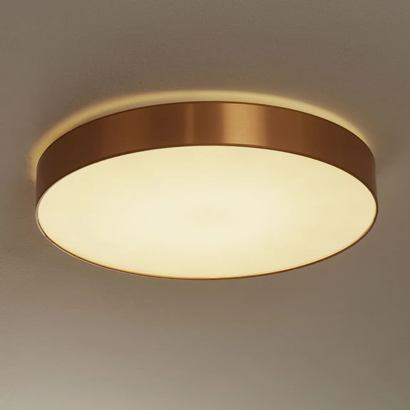 Aurelia ist eine runde, minimalistische LED-Deckenleuchte, die durch ihre einfache und schlichte Optik ideal zu unterschiedlichsten Einrichtungsstilen passt. Die gold-gebürstete Strukturfolie, die am Rahmen angebracht ist, lässt diese Leuchte zugleich edel wirken.