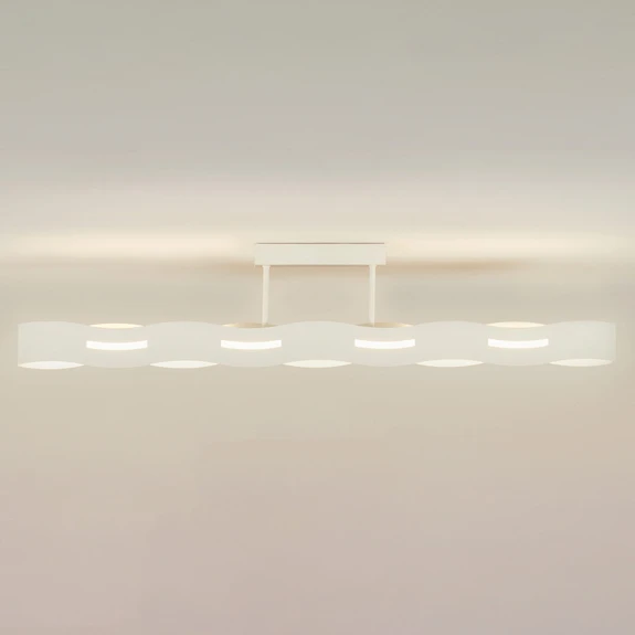 Die beiden wellenförmigen Metallelemente, die den direkten Blick auf die inliegenden LED-Elemente verbergen haben mehrere Öffnungen, durch die das Licht nicht nur nach oben und unten scheint, sondern auch zu den Seiten. Dank dieser Öffnungen wird der Raum gleichmäßig beleuchtet und das Wellenmuster der Leuchte verstärkt. Das Leuchtelement ist mit zwei Metallrohren am Baldachin befestigt. Die Leuchte ist über jeden Wandschalter dimmbar, da sie auf die Anzahl der Betätigungen des Schalters reagiert. Somit ist der Komfort einer dimmbaren Hauptbeleuchtung auch ohne Umrüstung möglich.