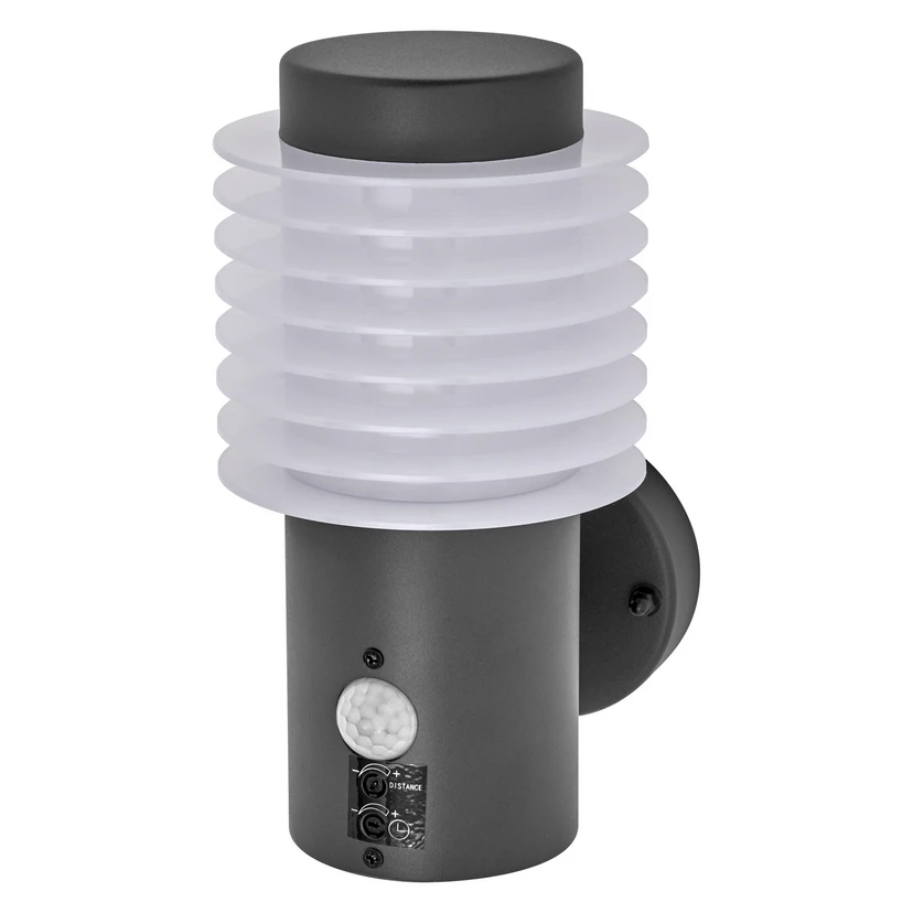 Rondo ist eine LED-Außenwandleuchte mit einem Gestell aus Edelstahl mit dunkelgrauem, mattem Finish und einem Diffusor aus mattiertem Polycarbonat mit vielen Lamellen, durch die das Licht gelenkt wird und blendfrei strahlt. Der verbaute Bewegungsmelder mit Dämmerungssensor schaltet das Licht in der Dunkelheit automatisch ein, sobald eine Bewegung erkannt wird, wobei Leuchtdauer und Entfernung eingestellt werden können. Die LED-Wandleuchte Rondo aus der Reihe Endura Style von LEDVANCE ist perfekt für Eingangsbereiche, Terrassen oder Balkone.