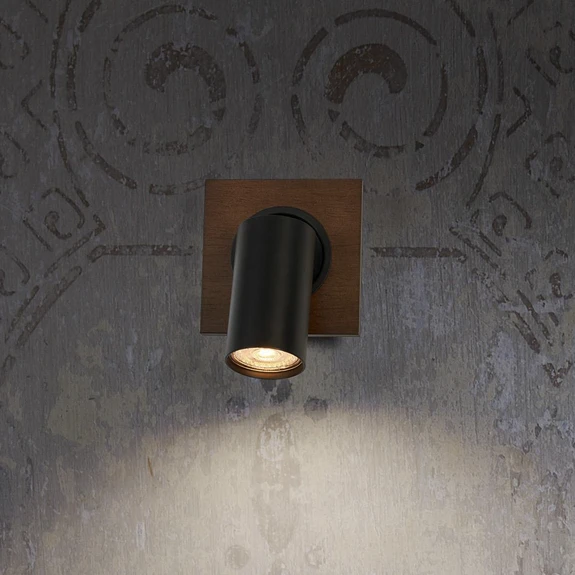 Der einflammige LED-Wandstrahler fällt durch eine schöne Mateialkombination und ein schlichtes Design auf. Am Wandelement, das wie der Strahler aus lackiertem Stahl besteht, sitzt eine Dekorplatte aus dunklem Holz. Der Spot mit hochwertiger Optik und Haptik ist verstellbar und mit einem Schalter seitlich am Gehäuse ausgestattet, so dass er sich auch sehr gut als Leseleuchte oder als Ersatz einer Nachttischlampe am Bett eignet. Das mitgelieferte, dimmbare GU10-LED-Leuchtmittel ist austauschbar.