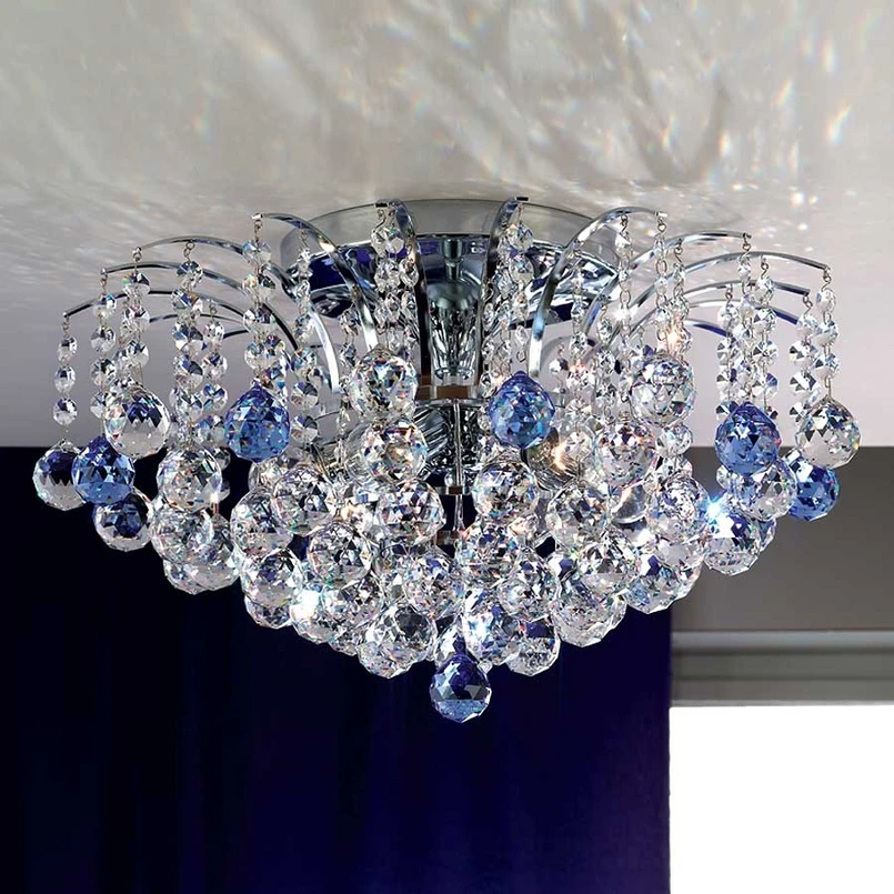Unzählige geschliffene Kristallkugeln schmücken die luxuriöse Deckenleuchte LENNARDA. An dem in glänzender Chromoptik gehaltenen Metallgestell sammeln sich üppig die Kristalle (Ø 40 mm). Die zum großen Teil klaren Kristalle werden durchbrochen von einigen blaugetönten Kugeln, die gelungene Akzente setzen und für einen interessanten Blickfang sorgen. Die Leuchtmittel befinden sich hinter dem Kristallvorhang, sodass das abgestrahlte Licht durch die Kristalle fein gebrochen und in zahlreiche Richtung gestreut wird. Damit sorgt die Deckenleuchte für besonders wirkungsvolle Lichteffekte.