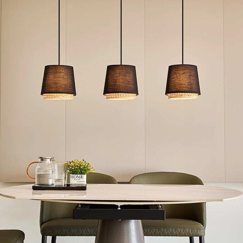 Ananya bringt ein rustikales Landhaus-Flair in die Inneneinrichtung. Die Hängelampe besteht aus schwarzem Eisen und besitzt sowohl an ihrer Deckenhalterung, als auch an ihren Leuchtenschirmen, markante Holz-Elemente, die ihr das gewisse Etwas verleihen. Die Leuchte kann mit E27-Leuchtmitteln bestückt werden und das generierte Licht wird zur Unterseite der Schirme abgeblendet. Ananya eignet sich aus diesem Grund perfekt für die Installation über einem Esstisch und sorgt für die nötige Beleuchtung beim Abendessen.