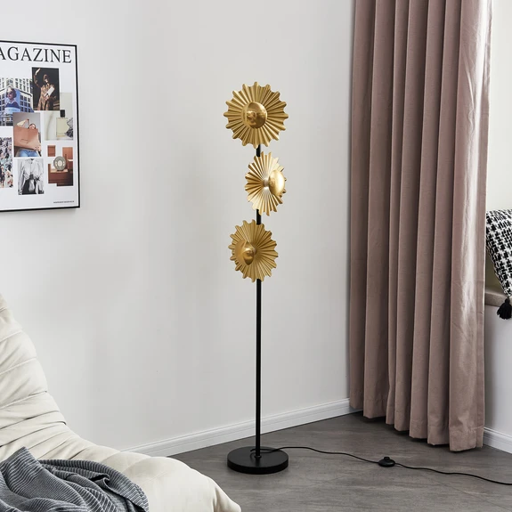Extravagante Stehleuchte Senmia mit drei goldenen Sonnen