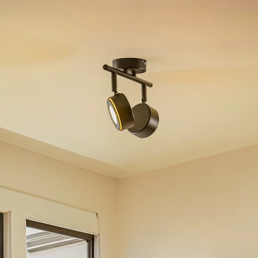 Der zweiflammige Deckenstrahler Jyla besteht aus Eisen und verleiht der Umgebung durch sein schwarzes Äußeres eine edle Note. Zugleich fügt er sich durch sein dezentes Design mühelos in unterschiedliche Wohnbereiche ein. Er lässt sich beispielsweise ideal als Lichtspender für den Flurbereich, die Küche sowie das Wohn- oder Esszimmer nutzen. Die runden Schirme sind verstellbar und sorgen damit für eine individuelle Ausrichtung des Lichts und eine optimale Ausleuchtung des Raums. Zwei GX53-Leuchtmittel sind im Lieferumfang enthalten.