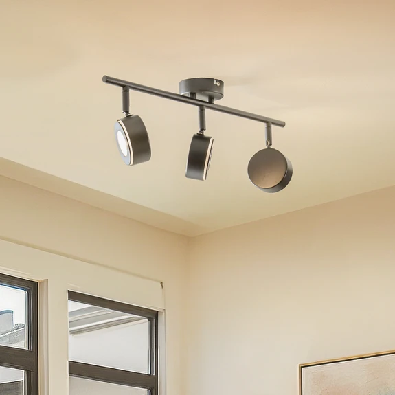 Der dreiflammige Deckenstrahler Jyla besteht aus Eisen und verleiht der Umgebung durch sein schwarzes Äußeres eine edle Note. Zugleich fügt er sich durch sein dezentes Design mühelos in unterschiedliche Wohnbereiche ein. Er lässt sich beispielsweise ideal als Lichtspender für den Flurbereich, die Küche sowie das Wohn- oder Esszimmer nutzen. Die runden Schirme sind verstellbar und sorgen damit für eine individuelle Ausrichtung des Lichts und eine optimale Ausleuchtung des Raums. Drei GX53-Leuchtmittel sind im Lieferumfang enthalten.