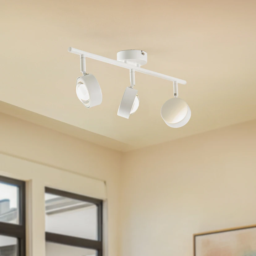 Der dreiflammige Deckenstrahler Jyla besteht aus Eisen und verleiht der Umgebung durch sein weißes Äußeres eine edle Note. Zugleich fügt er sich durch sein dezentes Design mühelos in unterschiedliche Wohnbereiche ein. Er lässt sich beispielsweise ideal als Lichtspender für den Flurbereich, die Küche sowie das Wohn- oder Esszimmer nutzen. Die runden Schirme sind verstellbar und sorgen damit für eine individuelle Ausrichtung des Lichts und eine optimale Ausleuchtung des Raums. Die mitgelieferten GX53-Leuchtmittel haben eine gewölbte Linse und sehen daher aus wie gläserne Halbkugeln.