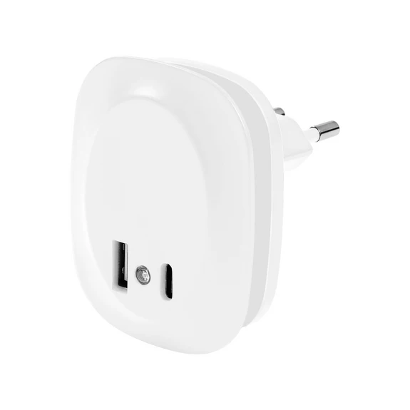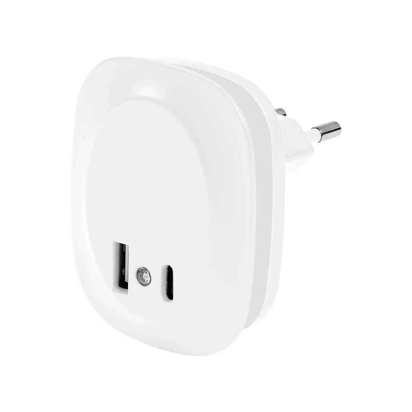 Das Steckdosen-Nachtlicht bietet nicht nur automatisch gesteuerte Orientierungsbeleuchtung bei Dunkelheit, sondern auch die Option zum Aufladen kleiner Elektrogeräte. Produkteigenschaften: USB A- und C-Anschluss mit Ladefunktion. Integrierter Tag-/Nacht-Sensor. Automatisches Ein- und Ausschalten abhängig vom Tageslicht. Plug-and-Play durch EU-Stecker. Energieeffizient durch LED-Technik. Anwendungsgebiete: Schlafzimmer. Kinderschlafzimmer. Korridore, Treppenhäuser. Nachtlicht. Nur für Innenraumbeleuchtung.