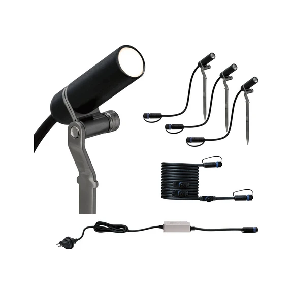 - Lieferumfang: drei Erdspießleuchten, Anschlusskabel, Steckertrafo