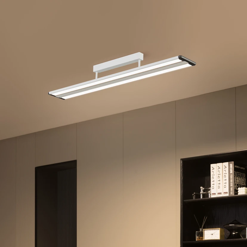 Yuela ist eine Office-Deckenleuchte in einem exklusiven und dezenten Design, die eine weiße Oberfläche besitzt und sich vielseitig einsetzen lässt. Die LEDs mit universalweißer Lichtfarbe, die sich gut zum konzentrierten Arbeiten anbeitet, sind in zwei Reihen angebracht und erzeugen ein gleichmäßiges Licht mit flickerfreier Wirkung. Der Lichtschein ist so hell, wie man ihn zum Arbeiten braucht, er kann aber auch den eigenen Wünschen entsprechend in seiner Helligkeit angepasst werden, denn die Leuchte ist extern dimmbar (DALI).