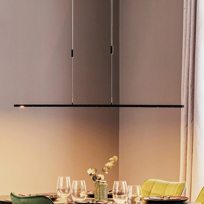 Bei der länglichen LED-Hängeleuchte Tolu handelt es sich um ein hochwertiges Leuchtenprodukt, das nach besten Qualitätsmaßstäben in Deutschland gefertig worden ist und mit einer perfekten Oberflächenverarbeitung punktet, wobei das Finish in aufwendiger Handarbeit vorgenommen worden ist und feine Bürstenstriche auf der Oberfläche aufweist. In Kombination mit dem dunklen Schwarz entsteht so ein kühler, aber eleganter Ausdruck und die Pendellampe mit ihren effizienten LEDs, die durchgängig als Band in die Unterseite der schmalen Leuchtstange eingelassen sind, eignet sich hervorragend für moderne Einrichtungen, wobei hier insbesondere Esszimmer die perfekten Einsatzorte sind. Da ist es auch ein Mehrwert, das man die Höhe der Pendelleuchte mit nur einem Handgriff im laufenden Betrieb schnell an die eigenen Vorstellungen und die Gegebenheiten vor Ort anpassen kann.