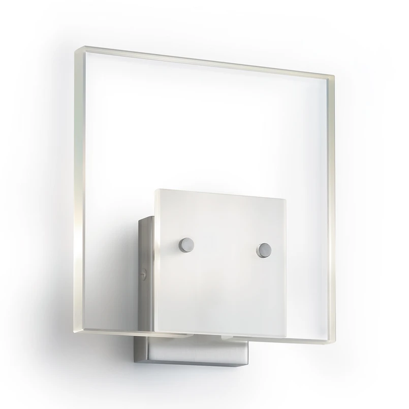 Ein großes viereckiges Glas steht bei der Wandleuchte GLASS im Vordergrund und zieht den Blick direkt auf die satinierten Ränder. Davor ist am unteren Ende ein kleineres, satiniertes Glaselement angebracht, hinter dem sich die Halterung in messing matt oder nickel matt sowie das Leuchtmittel verbirgt. Die Wandleuchte GLASS fügt sich in nahezu jeden Wohnstil ein und kann gleichzeitig als modernes Einrichtungselement an der Wand interpretiert werden.