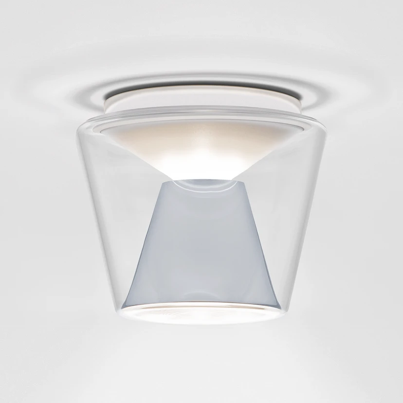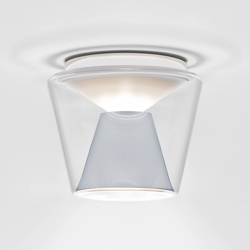 Die von Uwe Fischer für den Hersteller serien.lighting entworfene LED-Deckenleuchte fasziniert mit ihrem nach unten konisch zulaufenden Schirm aus klarem, mundgeblasenem Glas. Der wiederum nach oben verjüngte, in den Schirm gestellte Reflektor aus poliertem Aluminium sorgt für eine dezente Deckenaufhellung, während das warmweiße Licht zum Großteil nach unten direkt abgegeben wird.