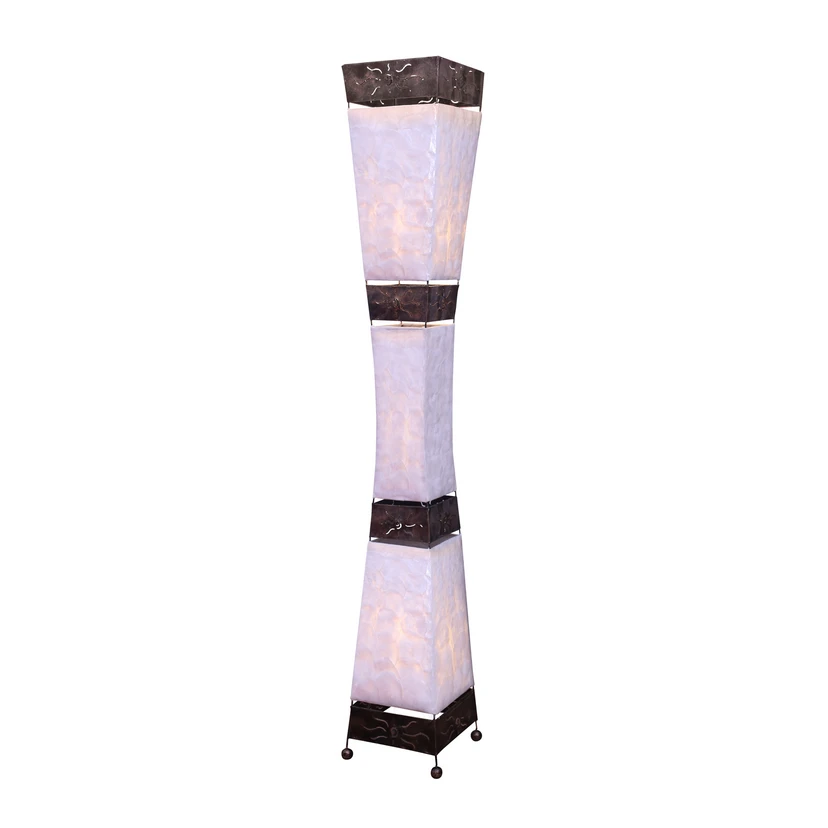 Stehlampe Adrian mit weißen Capiz-Muscheln und vier Abschnitten aus dunklem Metall