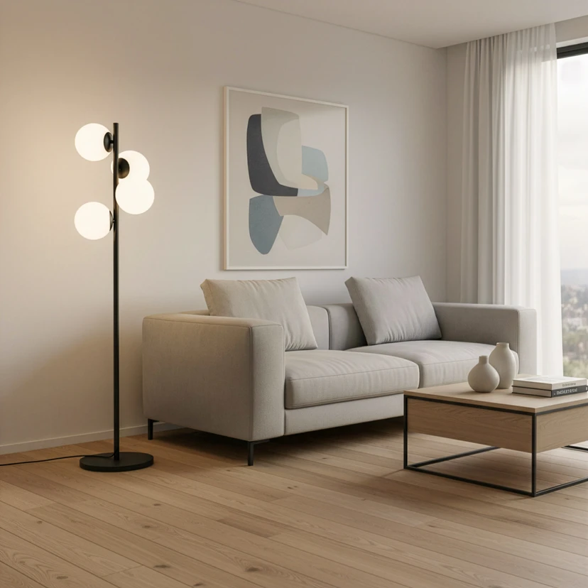 Die Glas-Stehleuchte Faze vereint stilvolles Design mit funktionaler Beleuchtung und ist die ideale Ergänzung für verschiedene Wohnbereiche. Gefertigt aus hochwertigem Glas und robustem Metall, bietet diese Leuchte eine harmonische Kombination aus Ästhetik und Langlebigkeit. Mit ihrer vierflammigen E27-Fassung sorgt sie für eine gleichmäßige und angenehme Lichtverteilung, die sowohl im Wohnzimmer als auch im Ess- oder Schlafzimmer eine behagliche Atmosphäre schafft.