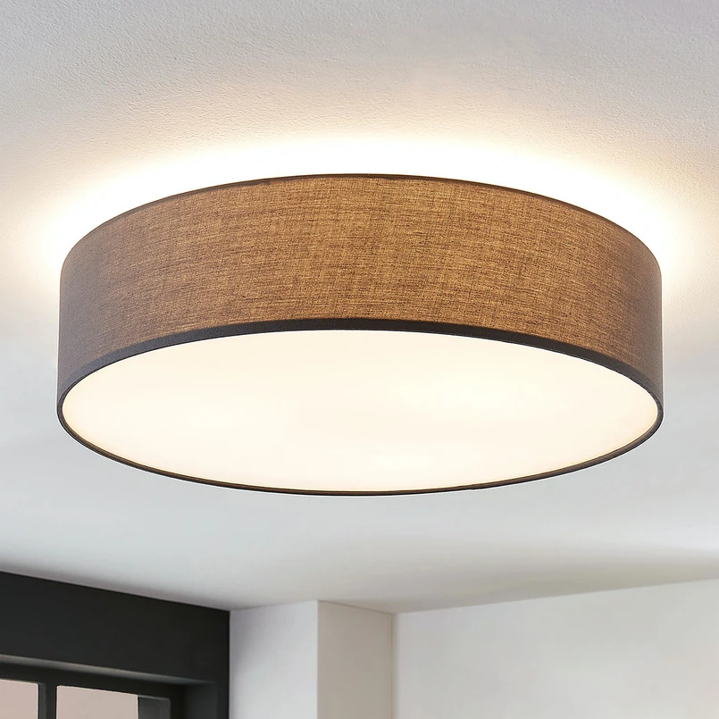 Graue Stoff-Deckenleuchte Gordana in runder Form - ideal für Wohn- und Schlafbereiche