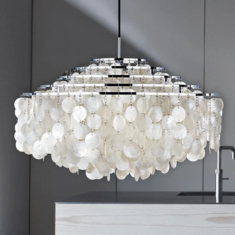 Im Jahre 1964 vom dänischen Designer Verner Panton entworfen, hat die Hängeleuchte Fun 11DM bis heute nichts von ihrem Charme eingebüßt. Mitte des 20. Jahrhunderts verschaffte sich Panton als Möbel- und Leuchtendesigner einen Namen. Er wurde vor allem durch seine ausgefallenen Kreationen berühmt, die allesamt Pantons unverwechselbare Handschrift tragen. Einer seiner ersten Entwürfe war die Leuchtenserie Fun. Inspiriert von den faszinierenden Eigenschaften des Biominerals Perlmutt, schuf der damals 38-Jährige ein Beleuchtungsobjekt, das mit Transparenz und schillernden Reflexionen spielt. An fünf glänzend verchromten, konzentrischen Metallringen sind Dutzende Ketten aus Perlmutt-Plättchen befestigt, die mit Edelstahl-Ringen miteinander verbunden und somit beweglich sind. Nicht nur die Transluzenz, sondern auch die typische, irisierende Oberflächenstruktur des Perlmutts macht sich diese Hängeleuchte zunutze, um einen unvergleichlichen Glanzeffekt entstehen zu lassen. Zurecht trägt diese Leuchte auch den Beiname "Mother of Pearls".